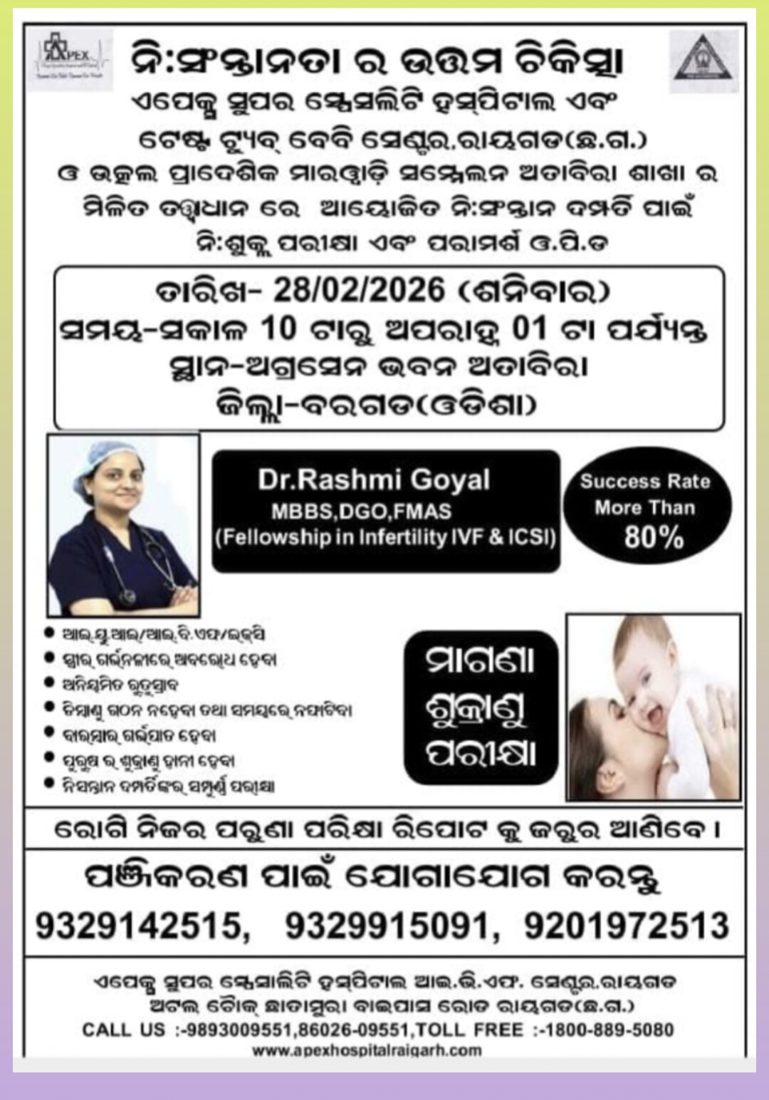 अताविरा, 25/2(संस्कृति मिडिया )-अपेक्स सुपरस्पेशलिटी हॉस्पिटल एवम् आईवीएफ सेंटर रायगढ़ व उत्कल प्रादेशिक मारवाड़ी सम्मेलन...