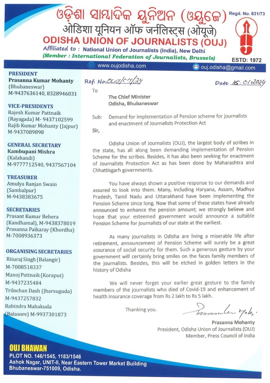 ପେନସନ୍ ଓ ସୁରକ୍ଷା ଆଇନ ଦାବିରେ ମୁଖ୍ୟମନ୍ତ୍ରୀଙ୍କୁ ଓୟୁଜେର ଦାବିପତ୍ର