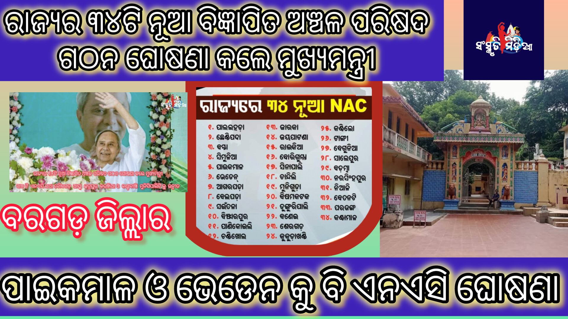 ଭୁବନେଶ୍ବର,24/2-(ସଂସ୍କୃତି ମିଡ଼ିଆ )ମୁଖ୍ୟମନ୍ତ୍ରୀ ଶ୍ରୀ ନବୀନ ପଟ୍ଟନାୟକ ରାଜ୍ୟର ୨୦ଟି ଜିଲ୍ଲାରେ ୩୪ଟି ନୂତନ ବିଜ୍ଞପିତ ଅଞ୍ଚଳ ପରିଷଦ ଗଠନ ଏବଂ ଚାରିଟି ଜିଲାର ପାଞ୍ଚ ଟି ଏନଏସି କୁ ମୁନିସିପାଲିଟି କୁ ଉନ୍ନୀତ କରାଯିବା ବିଷୟ ଶନିବାର ଘୋଷଣା କରିଛନ୍ତି। ସେଥିମଧ୍ୟରୁ ବରଗଡ଼ ଜିଲ୍ଲାର ଭେଡେନ ଓ ପାଇକମାଳ କୁ ଏନଏସି ଘୋଷଣା କରିଛନ୍ତି ମୁଖ୍ୟମନ୍ତ୍ରୀ ନବୀନ ପଟ୍ଟନାୟକ l