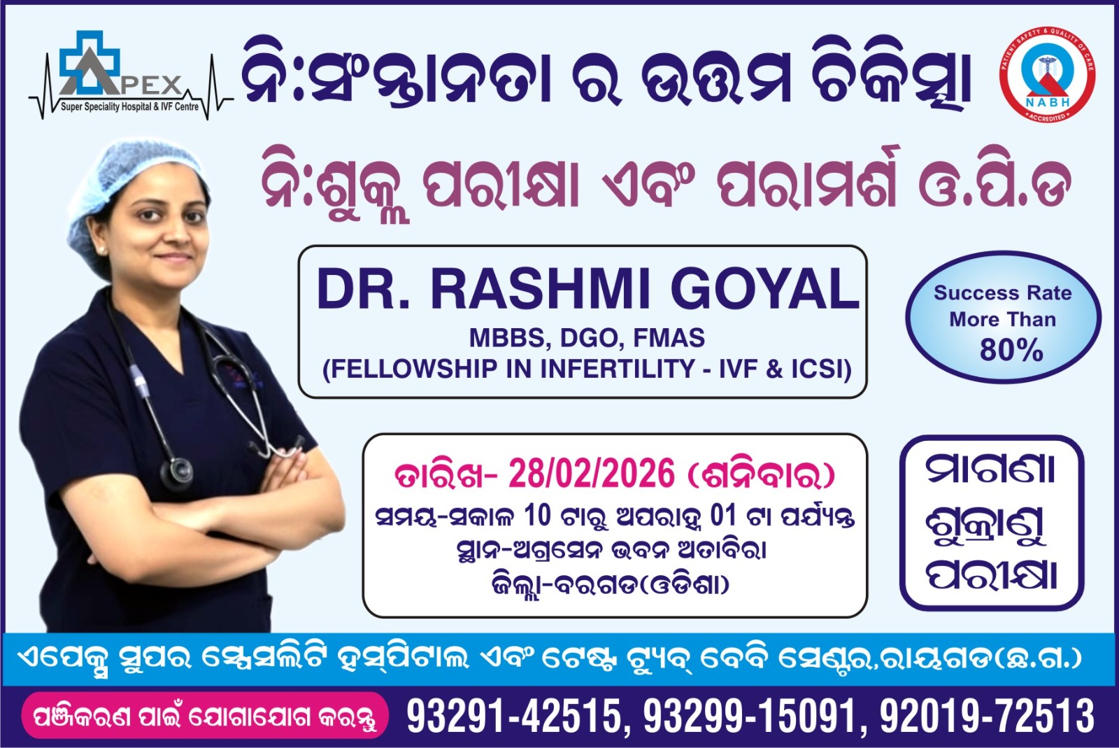 अताविरा, 19/2(संस्कृति मिडिया )-अपेक्स सुपरस्पेशलिटी हॉस्पिटल एवम् आईवीएफ सेंटर रायगढ़ व उत्कल प्रादेशिक मारवाड़ी सम्मेलन अताबीरा शाखा के संयुक्त तत्वावधान द्वारा आयोजित, निःसंतान दंपतियों के लिए निःशुल्क जांच एवम् परामर्श ओपीडी का आयोजन दिनांक 28 फरवरी 2026, दिन शनिवार को अग्रसेन भवन,अताबीरा,जिला- बरगढ़ (ओडिशा) मे किया जा रहा है जिसमे इनफर्टिलिटी विशेषज्ञ डॉ रश्मि गोयल,निःशुल्क जांच एवम् परमर्श हेतु उपलब्ध रहेंगी।