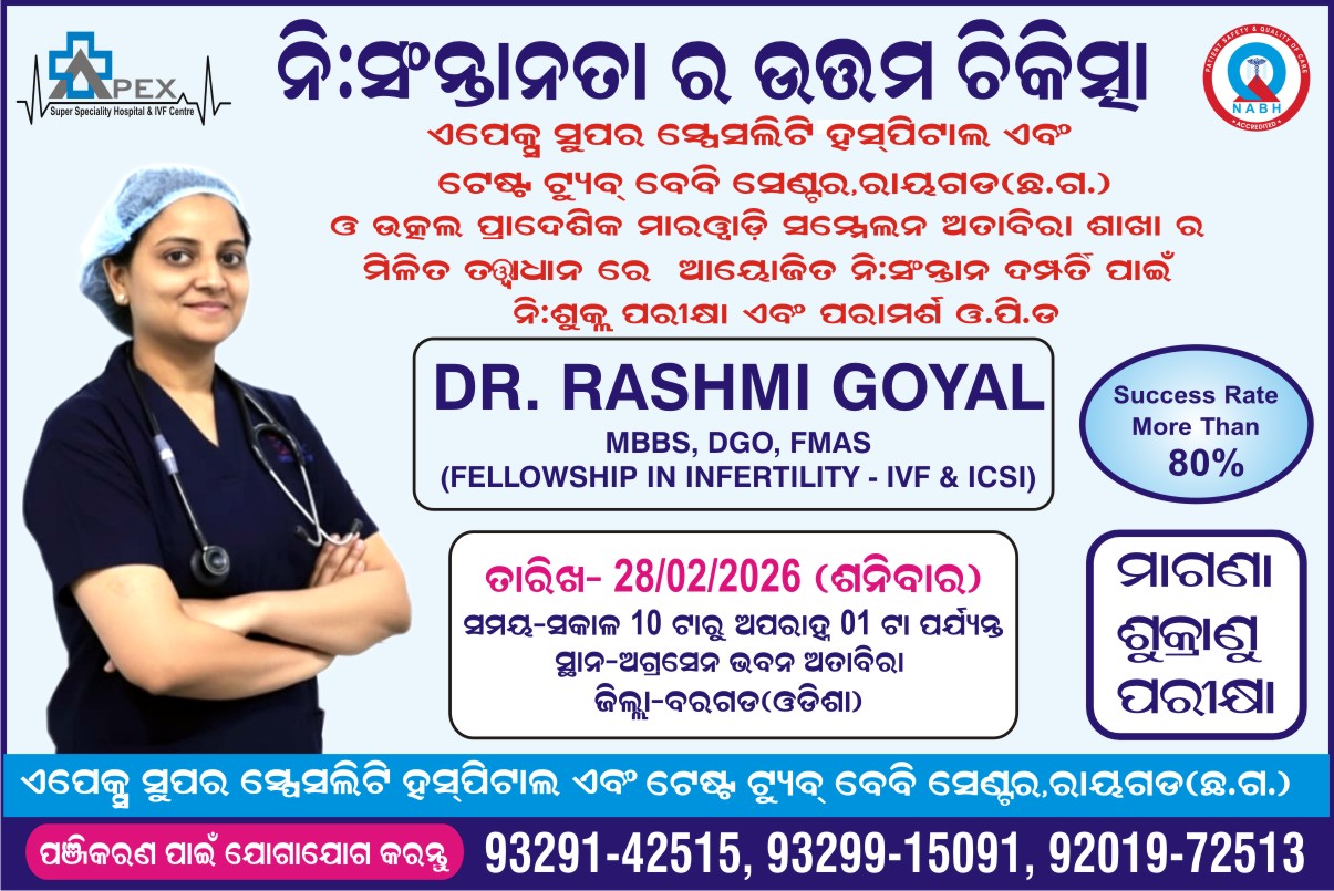 अताविरा, 27/2(संस्कृति मिडिया )-अपेक्स सुपरस्पेशलिटी हॉस्पिटल एवम् आईवीएफ सेंटर रायगढ़ व उत्कल प्रादेशिक मारवाड़ी सम्मेलन अताबीरा शाखा के संयुक्त तत्वावधान द्वारा आयोजित, निःसंतान दंपतियों के लिए निःशुल्क जांच एवम् परामर्श ओपीडी का आयोजन दिनांक 28 फरवरी 2026, दिन शनिवार को अग्रसेन भवन,अताबीरा,जिला- बरगढ़ (ओडिशा) मे किया जा रहा है जिसमे इनफर्टिलिटी विशेषज्ञ डॉ रश्मि गोयल,निःशुल्क जांच एवम् परमर्श हेतु उपलब्ध रहेंगी।